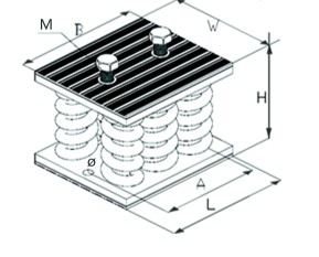 該產品充分利用綜合鋼彈簧的低頻和橡膠減振的阻尼特性,可消除高頻傳遞,達到明顯的減振降噪效果,又能解決機械設備重心不均的減振難點。